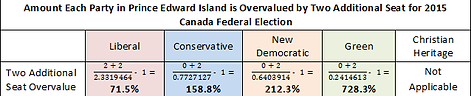 A second additional seat overrepresents the Liberal, Conservative, New Democratic and Green parties by 71.5%, 158.8%, 212.3% and 728.3% respectively. The Christian Heritage party only ran in a single district and so could not get a second additional seat in P.E.I.. Because there are only 2 additional seats to be distributed in P.E.I., there is no need to consider how overrepresented a party would be by three or more additional seats.
