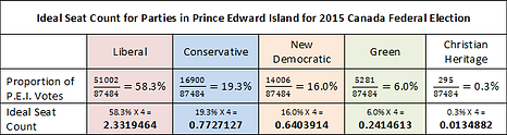 Let's see how seat count is determined for each party in the P.E.I. districts in the 2015 Canada federal election.