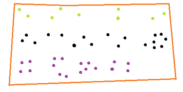 Overall, the lime party has 9 supporters (20%), the black party has 18 supporters (40%) and the purple party has 18 supporters (40%). Majoritarian systems don't care about overall support - to see the election results for a majoritarian system we need the district boundaries. Below are two different ways that the region has been divided in the past: